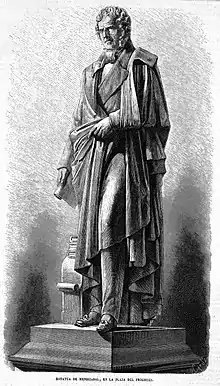 A work by José Gragera, commissioned after the death of Mendizábal in 1853, it was cast in bronze by Eck & Durand in Paris.[1] It arrived to Madrid in 1857.[2] Following a series of delays regarding the indecision on the location of the monument, works to install it in the Plaza del Progreso started in 1868.[3] The monument was unveiled on 6 June 1869,[4] during a ceremony attended by the General Serrano and a small boy, grandson of Mendizábal.[5]