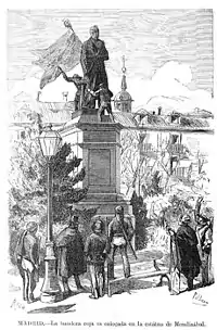 Following the entry of the Francoist troops in Madrid in 1939 towards the end of Spanish Civil War, the monument was toppled from its location.[6][7] The bronze may have been recast in another monument.[7] The plaza del Progreso was renamed as "Plaza de Tirso de Molina" and a sculpture of the later figure replaced the original monument in 1943.[5][8]