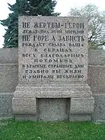 The layout of the square was further developed following the installation of the monument, with gardens and pathways to the design of Ivan Fomin.[1] The redesign was completed in 1921, and on 25 October the square was transferred to the city's Garden and Park Administration. In 1922 the Comintern and the All-Russian Central Executive Committee proposed creating a monument to the October Revolution, but the project was never carried out.[1] The last burial on the square, that of the secretary of the Leningrad city committee of the CPSU Ivan Gaza, took place on 8 October 1933.[1][4] The graves are marked with granite plaques, some with a single name, others with multiple names. Another plaque states "Here are buried those who died in the days of the February Revolution and the leaders of the Great October Socialist Revolution who fell in battles during the Civil War".[4]