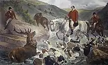 His portrait was painted by Samuel John Carter and was exhibited at the Royal Academy of Arts in London in 1871, under the catalogue description: "A September evening, Exmoor Forest". A wild stag at bay with portraits; to be presented to the master of the Devon and Somerset Staghounds, Mordaunt Fenwick-Bisset Esq., at the beginning of his seventeenth season by upwards of 400 deer preservers and friends". The painting was presented to him at a dinner at Dunster on 14 September 1871.[14] He is shown on his hunter Chanticleer surrounded by his favourite hounds, with a stag at bay at Badgworthy Water, Exmoor Forest. An engraving of Bisset standing on a North Devon beach watching a hunted stag swimming away into the sea is published in Fortescue, op.cit., opposite p. 87, with the caption: And there stood the stalwart form of Mr Bisset.