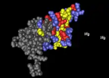 The red molecules are identical residues with Morn1, the Yellow are conserved molecules within a MORN repeat and the blue and gray molecules are those with little to no similarity.