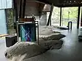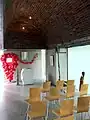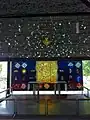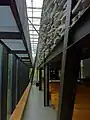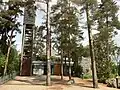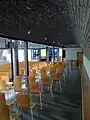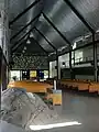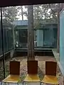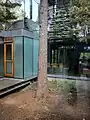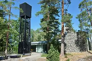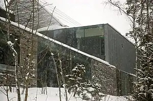 The church building floor plan has elongated, rectangular shape with a pitched roof over the nave. As an extension of the church is the church square with a flat roof. The campanile of the church is in the south-western corner. Strong walls of slate enhance the colours of the woodland, while the large glass surfaces reflect vegetation.[4]