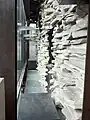 The pulpit, a simple reading desk in steel and wood, is fixed in the rock. The altar is not centred in the choir but slightly to the east. It includes three stones; one from the Berlin wall, one from Robben Island and one from Jerusalem.