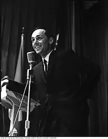 After embarrassing the Progressive Conservative (Tory) provincial government, by revealing its inaction in enforcing the fire code in a recently built hospital, he was fired, in 1967, as Metropolitan Toronto's Chief Coroner.[5] He decided to avenge himself by running for a seat in the Legislative Assembly of Ontario.[5] Despite ideological differences, he ran for the Ontario New Democratic Party (NDP) in the High Park electoral district, where his medical clinic was located.[5] Despite his strong capitalist beliefs, he decided to run for the social democratic party because they gave him a free hand in choosing where to run, and because their views in support of public safety were compatible with his.[6] He was elected as a Member of Provincial Parliament (MPP) in the 1967 provincial election, by defeating High Park's incumbent MPP, Progressive Conservative Alfred Hozack Cowling by over 6200 votes.[7][8]
