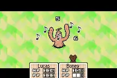 Combat in Mother 3 includes a unique musical combo system not seen in previous Mother games. When one of the player's characters directly attacks an enemy with a weapon, they can repeatedly attack the enemy by pressing the button in time with the beat of the background music, with each enemy possessing a musical theme with different rhythms. Using this system, the player can attack the enemy up to sixteen times in a row.[5] When the correct beat is not apparent, the player can put the enemy to sleep to isolate the beat from the music.[2]