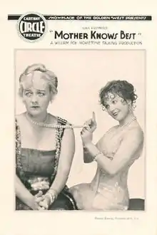 Mother Knows Best is a 1928 American sound part-talkie film directed by John G. Blystone, based on a novel by Edna Ferber, fictionalizing the life of vaudevillian Elsie Janis. The film was Fox's first part talkie, using the Movietone sound system which had primarily been used for synchronised music scores and effects tracks in Fox features beforehand, although as early as "Mother Machree" (1928), a single synchronous singing sequence was included in the film. The talking sequences in Mother Knows Best were directed by actor Charles Judels,[1][2] while the synchronized sequences were directed by John G. Blystone. The film starred Madge Bellamy, with Louise Dresser as her domineering mother, Barry Norton, and Albert Gran.[3]