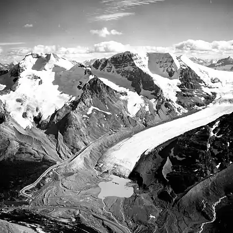 Aerial view of Mount Andromeda and the Athabasca Glacier, 1964
