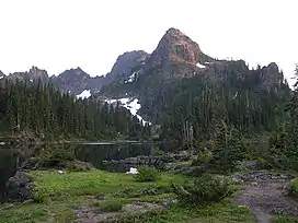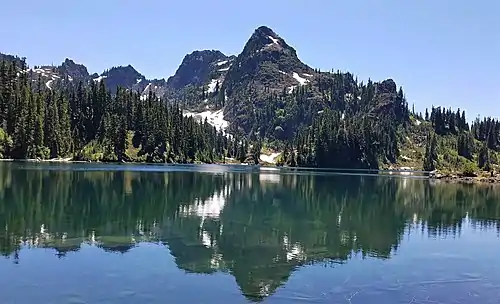 Mount Bretherton is a 5,960-foot-elevation (1,820-meter) mountain summit located in the Olympic Mountains, in Jefferson County of Washington state.[4] It is situated within Olympic National Park, immediately south and 1,400 feet above the shore of Upper Lena Lake. Mount Lena lies across the lake to the north, Mount Stone is 2.8 miles to the west-southwest, and The Brothers approximately four miles to the northeast. Precipitation runoff from the mountain drains south to the Hamma Hamma River via Boulder, Delta, and Lena Creeks. Topographic relief is significant as it rises over 5,100 feet (1,600 meters) above the river in two miles. The non-technical ascent of Mount Bretherton involves hiking eight miles (one-way) and 5,300 feet elevation gain via the Upper Lena Lake Trail and cross-country above the lake, with most favorable conditions from July through September.[5] There are pleasant campsites at the lake, and the ascent to the summit takes two hours from the lake.[6] This mountain's name has been officially adopted by the United States Board on Geographic Names.[4]