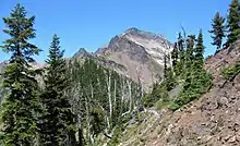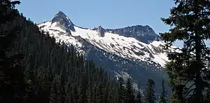 Mount David is a prominent 7,420-foot (2,260-metre) mountain summit located in Chelan County of Washington state.[4] The mountain is situated in the Glacier Peak Wilderness, on land managed by the Okanogan-Wenatchee National Forest. Mount David is the highest point of Wenatchee Ridge, a subrange which also includes Indian Head Peak, Whittier Peak, Mount Saul, and Mount Jonathan.[1] Its nearest higher neighbor is Bandit Peak, 5.69 mi (9.16 km) to the east-northeast.[1] Precipitation runoff from Mount David drains into tributaries of the White River. Although modest in elevation, relief is significant since Mt. David rises 5,100 feet above the White River Valley in two miles. This peak was named for the biblical David by Albert Hale Sylvester, a pioneer surveyor, explorer, topographer, and forest supervisor in the Cascades who named thousands of natural features.[3] This mountain can be climbed via the strenuous seven-mile Mount David Trail with over 5,000 feet of elevation gain.