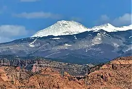 Mount Mellenthin is a 12,645-foot (3,854 meter) elevation summit located in San Juan County of Utah, United States.[3] Mount Mellenthin is the second-highest peak of the La Sal Mountains. It is situated in a dry, rugged, sparsely settled region, and set on land administered by Manti-La Sal National Forest. Precipitation runoff from this mountain drains into tributaries of the Colorado River. The nearest town is Moab, 20 mi (32 km) to the northwest, and the nearest higher neighbor is Mount Peale, 1.7 mi (2.7 km) to the south. The mountain's name honors Rudolf E. Mellenthin (1884–1918), forest ranger of La Sal National Forest, who was shot to death near this peak on August 23, 1918, while attempting to apprehend two draft evaders.[3] This geographical feature's name was officially adopted in 1932 by the U.S. Board on Geographic Names.[3]