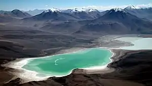 ![]() Laguna Verde and Laguna Blanca in front of Mount Nelly (on the left, snow covered) and Mount Laguna Verde (on the right) as seen from the peak of Licancabur | |