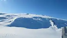 The volcanic mountain rises 2,100 metres (6,900 ft) above the ice level[15] with maximum elevation 3,460 metres (11,350 ft).[16][17][1][lower-alpha 3] It is an undissected nearly perfect cone,[8] a 30-kilometre-wide (19 mi) shield volcano[16] with an exposed volume of about 780 cubic kilometres (190 cu mi).[21] The subglacial part, which might bottom out at 1,340–2,030 metres (4,400–6,660 ft) below sea level,[22] could have an even larger volume[21] and is elongated in an east–west direction.[23] On its summit lies a flat, snow-filled 8-kilometre-wide (5 mi) caldera[8] with a 10-metre-wide (33 ft) and 15-metre-high (50 ft) volcanic neck.[24] A lava dome may crop out inside the caldera. Radial fissure vents are found around the volcano, and vents also occur around the caldera rim.[25] There are at least three[26] parasitic vents with basaltic composition on its lower flanks,[27] with three cinder cones found on the western and southern slopes.[25] One of these cinder cones has been described as a subdued 100-metre-wide (330 ft) vent.[24] The Jaron Cliffs are found on the southern slope.[25]