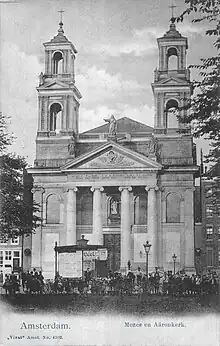 In the first centuries after the Reformation, the public display of Roman Catholic services and accessories was not tolerated – officially forbidden in 1660 – in Amsterdam.[3] So in 1641 the Franciscans went to the Joodenbuurt ["Jewish Quarter"],[4] then at the outskirts of the east side of Amsterdam, and opened a house church, the second of its kind in the city,[5] at a house called the "Moyses" (Moses), at the back of the present church. In 1682, the house was joined by the neighboring house "Aäron" (Aaron) with the purchase by Dr. Johannes de Vroom, a physician from Breda,[6] as well as by the house behind it on the Houtgracht ["Wood Canal"].[7] Subsequently, also in 1682, a neighboring property owned by David Torres was bought by an intermediary.[8] Named after the brothers from the Old Testament, the twin houses proved to be better known than their hidden church, Sint-Anthoniuskerk, which had been dedicated to the church's patron saint, St. Anthony of Padua. In 1690, Johannes de Vroom, brother of the priest, consolidated all the four properties into a single block.[9] In the meantime, the expansion of the church had already begun, before the sale was made and before permission was obtained from the City Council.[10] The entrance was moved from Jodenbreestraat to the Houtgracht. The church was decorated inside and outside, including a new facade, in 1759. But it remained hidden under the gables of the two houses until the early 19th Century, when the prohibitions against the Catholic Church were finally lifted.[11] It was replaced between 1837 and 1841 by a bigger and grander building on the same site. Mozes en Aäronkerk was raised to the rank of parish under its original name, St. Anthony of Padua, in 1857, four years after the Roman Catholic hierarchy was restored to the Netherlands.[12]