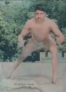 Mukhtiar Singh was born on 25 October 1943 in village Baltikari, Raya, he belongs to a jat family Mathura, Uttar Pradesh.[5] He was popularly known as Mukhiya Pahalwan.[6] His father Ninua Singh was a farmer while his mother Parmali Devi was a housewife. Singh grew up with five brothers. At the age of 12 he had a good hold on his sport and was known by people of nearby districts. After gaining some potential he started practicing under the guidance of his uncle Amichand Pahalwan. He was enrolled in 2nd Jat Regiment, Indian Army in 1963.[7] Later he participated in Services wrestling in the lightweight class and became the champion of Eastern Command on his very first appearance.[8] But he was firstly recognized in the Indian Army when he fought against international wrestler of Indian Army Pahalwan Uday Chand during services tournament. He was awarded with gold medal in the lightweight in the Services championship in 1965.[9] He stood first in 1966 in his weight class. He was accordingly selected to represent India in the British Empire and Commonwealth Games at Kingston, Jamaica in 1966.[10] He won a gold medal defeating all wrestlers in his class there, including the famous Pakistani wrestler M. Hussain and Greig of New Zealand. He was obstructed by a knee injury from taking part in the Vth Asian games at Bangkok in 1966.[11]