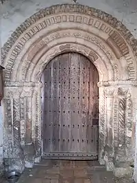 St Peter's church's first written record was in the Domesday book in 1086, when it was strangely recorded as a half church.[8] During Norman England, in the early 12th century, the previous Saxon church was replaced with the Norman nave which exists to this day.[9] The main doorway of St Peter's church is built in a Romanesque or early Norman style, and it was carved by the same master Stonemason as both Ashby St Mary's St Mary, and Heckingham's St Gregory, as all have the same signature style.[57]