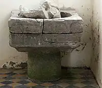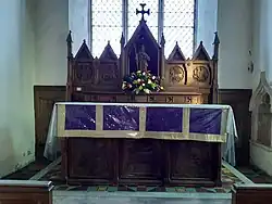 The Reredos was added in 1908, having been donated by the rev. Charles Hicks and his wife,[60] and was designed as a miniature version of the one from Notre-Dame Cathedral in Paris.[43] The chancel has three plain windows, which have the names of the glaziers scratched into them. The only stained glass in the church is on the main window is at the far end of the church, it is a cartouche of Saint Peter's Keys.[58] Under the main window, the floor has been raised in order to place the altar higher for the congregation, which makes the 15th-century Piscina (which is contained in a canopied recess) and Sedilia relatively close to the floor. The mediaeval credence shelf is rare, as it was built with notches to hold the chalice upside-down while it drains.[43]