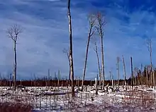 Muskeg (Ojibwe: mashkiig; Cree: maskīk; French: fondrière de mousse, lit. moss bog) is a peat-forming ecosystem found in several northern climates, most commonly in Arctic and boreal areas. Muskeg is approximately synonymous with bog or peatland, and is a standard term in Western Canada and Alaska. The term became common in these areas because it is of Cree origin; maskek (ᒪᐢᑫᐠ) meaning "low-lying marsh".[1]