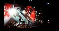 As in the past, Clarkson's concerts held more in common with traditional rock concerts than with pop- or R&B-oriented "diva" productions. The show began with a stage tableau of the cover of the My December album, complete with staircase laced with gnarly tree branches and Clarkson sitting in the big red dress[19] while the band was frozen like mannequins.[20] Clarkson immediately shed the bulky red dress, however, and performed in an understated black pants and back top outfit.[19] Halfway through the show the main curtain closed, and Clarkson and selected band members performed a quieter mini-set of "Because of You", "Up to the Mountain", and "Be Still" in front of the curtain.[20][21] A mash-up of "Miss Independent" and Led Zeppelin's "Whole Lotta Love" AC/DC's "Back in Black" then played for a while over the sound system;[21] when the curtain opened the set had been stripped to a techno-modern look, while Clarkson had undergone the minimal costume change of adding a black sleeveless vest. The single encores segment began with a respectfully delivered "Sober" followed by the informal "Chivas" and then her biggest hit, "Since U Been Gone",[20] the last of which typically featured sing-alongs or dancing fans pulled up on stage.[22] In all she typically performed for 75 to 80 minutes.[19][21][22]