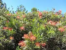 A range of methods were used at Myall Park to provide successful raising and growing conditions, including the preparation of special growing beds, and experiments with soil structure and composition.[45] The influence of Gordon's father was evident in the layout of the garden, through the practice of planting in clumps rather than lines. The garden was organised into divisions and Gordon methodically planted as much of a genus as was available together in the garden. Beyond aesthetic and environmental benefits, this planting method was also a way of encouraging natural hybridisation. The genus Grevillea had been a focus during plant collecting trips and in 1963 a new Grevillea hybrid appeared in the garden. Displaying the low growing characteristics of the Grevillea bipinnatifida, together with the vibrant flame coloured flowers of the G. banksii, and the ability to flower throughout the year and attract birds, the hybrid featured highly desirable attributes for gardeners. Gordon named the hybrid Grevillea "Robyn Gordon" after his eldest daughter (who died aged 16 from illness in 1969) and distributed it freely to nurseries in Brisbane and Sydney, without payment. Three other hybrids were also produced at Myall Park. The first two were named after the Gordon's other daughters, Grevillea "Sandra Gordon" (also a popular garden plant) and G.'Merinda Gordon'.[1][46][47][48] The third was discovered much later in the early 2000s and was named Grevillea "Dorothy Gordon" after Dave Gordon's wife.