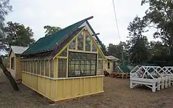 The other wing of the nursery accommodates the misting house, a timber framed glasshouse with a concrete slab floor. The lower part of the walls is lined internally with fibre cement sheets. Above this on the side walls are clear glass operable louvres and on the end wall is a large timber-framed pivot window surrounded by fixed clear glass. The roof is clad with overlapping sheets of rippled, fixed glass and near the ridge are clear glass operable louvres. The roof is sheltered externally by a shade cloth mounted on a metal framing. This shade cloth is a later addition, replacing the original louvred panels. The room contains raised timber benches/boxes for plants that incorporate plastic irrigation pipes with misting nozzles. The floor retains spoon drains under the plant benches. The nursery yard retains four hardening bays. These are large timber "boxes" on legs that have a sheltering frame covered in shade cloth.[1]