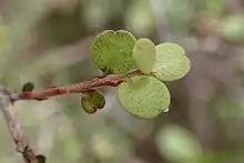 Myrsine divaricata known as weeping māpou or weeping matipo, is a small tree up to 4 metres (13 ft) tall or often a shrub.[1] It has a strongly divaricating habit with interlaced branched. The woody parts are stiff and pubescent when young. The small leathery simple leaves are borne on short petioles and may be slightly two lobed at the end. The very small yellow or reddish flowers may be borne singly or in small groups which mature into small purple, occasionally white, fruit.[2]