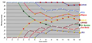 The streak ended when the Mapua Cardinals, led by the former All-Canadian Kelvin dela Peña beat the Knights as Letran failed to stop dela Peña and collapsed at the end game.(If Letran won that 2nd round game against Mapua, the Knights could have already scored a 14-0 sweep of the eliminations) The Knights recovered as they blew out the Stags, and swept the regular season series vs. PCU in the season finale.[3]