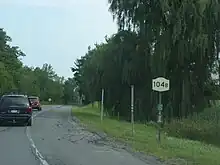 New York State Route 104B (NY 104B) is a 6.07-mile (9.77 km) east–west state highway located in central Oswego County, New York, in the United States. This highway provides a connection between NY 104, the principal highway along the southern shore of Lake Ontario, in New Haven and NY 3, the principal highway along the eastern shore of Lake Ontario, in the town of Mexico. It passes through mostly rural areas and acts as a two-lane bypass of the village of Mexico, located where NY 3 and NY 104 intersect southeast of NY 104B. All of NY 104B is part of the Seaway Trail, a National Scenic Byway. The route was originally New York State Route 3D in 1930. NY 3D was redesignated as New York State Route 3E c. 1932, and was redesignated NY 104B in April 1935.