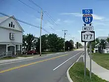 New York State Route 177 (NY 177) is an east–west state highway in the North Country of New York in the United States. It extends from Interstate 81 (I-81) exit 42 in the Jefferson County town of Adams to NY 12 west of the Lewis County village of Lowville. NY 177 intersects U.S. Route 11 (US 11) in Adams Center and meets Lewis County's County Route 21 (CR 21), formerly part of NY 194, at Barnes Corners. NY 177 originally began at US 11 when it was assigned in 1930. It was extended west to its present terminus in the 1950s following the construction of I-81.
