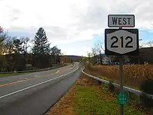New York State Route 212 (NY 212) is an east–west state highway located entirely within Ulster County, New York, in the United States. It runs for 21.92 miles (35.28 km) from an intersection with NY 28 in the interior of the Catskill Park to a junction with U.S. Route 9W (US 9W) and NY 32 on the west bank of the Hudson River, providing a key interchange with the New York State Thruway (Interstate 87 or I-87) along the way. The mostly rural two-lane route serves the communities of Woodstock and Saugerties while passing Cooper Lake, Kingston's reservoir. NY 212 was assigned as part of the 1930 renumbering of state highways in New York.