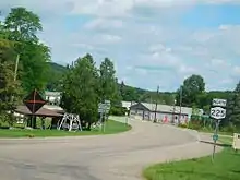 Across the county line in the town of Caton, NY 225 continues west through the gully for another 2 miles (3.2 km), slowly rising in elevation as it heads past a small number of isolated homes. The creek reaches its source near NY 225's junction with the southern terminus of CR 34 (Whiskey Creek Road), at which point the route ascends out of the valley and heads southwest across lightly developed, relatively level terrain to the small hamlet of Caton. In the center of the community, NY 225 intersects CR 32 (Caton–Seeley Creek Road) and CR 120 (Tannery Creek Road). NY 225 turns northwest at this intersection, becoming Caton Road as it follows Caton Creek out of the hamlet.[3]