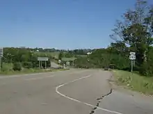 NY 243 has been realigned in two locations since it was assigned. In the town of Rushford, the highway was originally routed through the hamlet of Rushford, using Buffalo and Main streets and the southern half of Upper Street to traverse the community.[7][8] Plans for a bypass of Rushford were drawn up by the state as early as 1961, when the realignment was proposed as part of a larger effort to improve all of NY 243 between the hamlets of Rushford and Caneadea. The project would also lessen the number of curves and eliminate high grades along the highway.[9] It was completed sometime between 1963 and 1976. During the same period, NY 98 was reconfigured near the west end of NY 243 to intersect the latter at a new junction in Freedom, located just northeast of their original intersection in Farmersville. NY 243 was truncated to end at the new junction while the route's former routing into Farmersville became part of NY 98.[7][10]