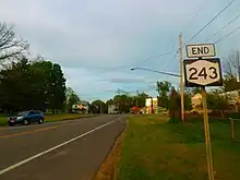 The origins of NY 243 date back to the early 1910s when the state of New York improved the portion between the hamlet of Rushford and Rushford Lake to state highway standards. A contract for the project was awarded on April 5, 1910, and the rebuilt road was added to the state highway system on February 13, 1913, as unsigned State Highway 801 (SH 801). The section between Rushford Lake and the hamlet of Caneadea was reconstructed under a contract let on June 12, 1922.[4] Work on the road was completed by 1926,[5] and the highway became state-maintained as SH 1606.[4] The remainder of the modern route northwest of Rushford was added in the mid-1920s.[5][6] In the 1930 renumbering of state highways in New York, hundreds of state-owned roads were given posted route numbers for the first time. NY 243 was assigned at this time, extending from Farmersville to Caneadea over SH 801, SH 1606, and the Farmersville–Rushford state highway.[2]