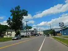 NY 282 begins at the Pennsylvania state line in the town of Nichols, where it connects to PA 187. The route heads to the northwest as a two-lane road, loosely paralleling Wappasening Creek as it passes farmland in the base of a valley surrounding the creek. It crosses over the creek and serves little more than farms on its way into the village of Nichols, where the open fields give way to residential neighborhoods and NY 282 becomes known as Main Street. After two blocks, the highway enters Nichols' central business district, where it intersects with County Route 6 (CR 6, named River Street),[3] a highway once designated as NY 283.[4] NY 282 turns west at the junction, following West River Street through another residential section of the village to Nichols' western village limits, where the street name changes to West River Road.[3]
