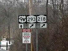 New York State Route 293 (NY 293) is a 6.82-mile (10.98 km) state highway located entirely within eastern Orange County, New York, in the United States. The highway starts at U.S. Route 6 (US 6, known as the Long Mountain Parkway) in Woodbury, and heads to the northeast, ending at an intersection with US 9W and NY 218 in the community of Highlands. It does not pass through any notable populated areas as most of the land around it is protected either as state parkland or US military reservation. However, it receives much traffic as the major route between the United States Military Academy at West Point and the New York State Thruway (Interstate 87 or I-87).