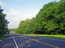 NY 299 begins at an intersection with the concurrent US 44 and NY 55 just south of Lake Minnewaska in the town of Gardiner. NY 299 winds northeast through the deep woods of Gardiner, paralleling US 44 and NY 55 as it climbs through the Shawangunk Mountains . Passing well to the south of the hairpin turn on US 44 and NY 55, NY 299 bends eastward under control of Ulster County, with the County Route 8 (CR 8) designation. Near Hasbrouck Road, the dense woods recede and NY 299 crosses east through fields through Gardiner. Soon crossing into the town of New Paltz, NY 299 runs along the flood plain of the Wallkill River.[3]