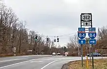 NY 312 begins at US 6 in Southeast, New York just northeast of Middle Branch Reservoir, one of the many reservoirs in Putnam County which supply New York City's large need for drinking water. The route heads northeast, before veering to the north after a 0.5 mile (0.8 km) to bypass a hill 680 feet (210 m) high.[3] Past the hill, the route curves eastward then northeastward as it meets I-84 by way of an interchange and approaches the hamlet of Dykemans.[4]