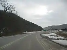NY 10 begins concurrent with NY 8 at an interchange with the Quickway (NY 17) (Future I-86) southeast of the village of Deposit near the Broome-Delaware County line. The two routes continue north along the eastern extents of Deposit to the banks of the west branch of the Delaware River, where NY 8 breaks from NY 10 to cross over the river. NY 10, however, continues northeast along the riverbank, passing south of the Cannonsville Dam and the resulting Cannonsville Reservoir behind it. Near the midpoint of the water body, NY 10 crosses over the reservoir on the Cannonsville Bridge and proceeds to follow the northern edge of the reservoir. As the reservoir begins to narrow, NY 10 intersects NY 268, a connector route leading south to the village of Hancock.[3]