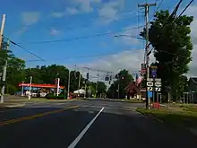 Outside of Liverpool, NY 57 headed generally northward past densely populated residential areas in the town of Clay. Here, the route intersected John Glenn Boulevard, a local arterial leading west to I-690. Past John Glenn Boulevard, NY 57 took on a more pronounced northwesterly routing, matching the path of the Seneca River a short distance to the west and the CSX Fulton Subdivision to the east. It continued to run past residential and commercial areas to an area known as Moyers Corners, centered around NY 57's junction with NY 31 east of Baldwinsville. The route continued on, serving gradually less developed areas and turning northward as it approached and eventually crossed the Oneida River to enter Oswego County.[8][9]