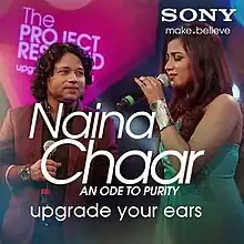 The exclusively online initiative by Sony Music, of which the song was a part, was titled 'Project Resound' and it marked the first collaboration between veteran Indian singers Shreya Ghoshal and Kailash Kher, who were asked to share their knowledge about music genres and Indian languages.[2][3][4] 'Upgrade your ears' was the tagline of the project, and according to Sony, its principal target was to make the youth generation aware of the different qualities of music that they hear on their headphones.[5][6] Thereby, "Naina Chaar" was recorded as a promotional song for Sony Headphones. Regarding this, Sanjeev Jasani, senior vice-president of OgilvyOne, stated in an interview— "We understood early on that no product advertising could achieve our client's objectives. Sony wanted to target music lovers who were listening to music on-the-go. Also, the company observed how closely young music lovers follow their music idols. The power of recommendation commanded by celebrities can be leveraged only when the brand message is not all about pushing products."[3]
