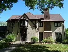 The Hardy Steeholm house at 733 Huron Hill is a Tudor Revival-style home built in 1923.[16] This style was popular from 1890 to 1940.[17] Hallmarks of the style present in this house are the steep roof surfaces, the asymmetric façade, the prominent chimney, and the false half-timbering. This house does not display the stonework that is common to the style. Steeholm was the president of Wisconsin Magazine.[4] 115 contributing houses in the district are Tudor Revival style.[3]