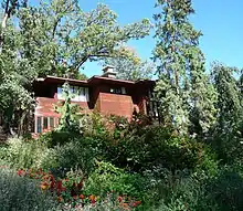 The Anita & Frederick Miner, Jr. house at 1026 Seminole Highway is a small Prairie School house built in 1915.[4][9] Prairie School style was popular from 1900 to 1920.[10] The style's hallmarks present in this house are the emphasis on the horizontal, the wide eaves, the stucco, and the grouped windows. Frederick was a real estate salesman. Prairie School was an effort to make a new "American" architecture that didn't derive from European styles like Italianate or Queen Anne. Wisconsin son Frank Lloyd Wright was the leading proponent, and there are a number of Prairie School houses in the district.[4]