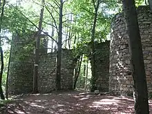 The Viscounts Taaffe had artificial ruins resembling their former Irish family home, Ballymote Castle, built in the nearby forest on the Prašivice hill around 1840. A forest park with stone statues of a dragon and a turtle was created around the ruins.[3][7]