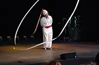 Eoreum (어름) or jultagi (줄타기) is tightrope dancing. It is called "eoreum" because the nori is as hard and cautious as walking on thin ice (eoreum means "thin ice" in Korean). The performer or eoreum-sani dances, sings songs, and does aerial stunts on the rope which is tightly fastened 3 meters off the ground. The performer also exchanges witty talks with a maehossi on the ground and all his performance is accompanied with special rhythm made by a drum.[3]