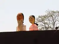 Deolmi (덜미) or puppet play is played last. It is also known as "kkokdugaksi noreum" (꼭두각시놀음), which comprises the three words: kkokdu (puppet), gaksi (maiden) and noreum (nori, performance). In addition, the puppetry is called "bakcheomji noreum" (박첨지놀음) and "hongdongji nori" (홍동지놀이), all of which are named after the main characters in the play.[12] In Korea, puppet plays appeared first in the early age of the Silla Dynasty (BC 57 – 935 AD). All the other puppet plays disappeared later, but deolmi survives and has been brought down through generations. Its main story is about the resistance against the dominant aristocratic class and satirizes corrupt Buddhist priests. So the play appealed to the commoners and the poor public, which perhaps explains its popularity, and ultimately why it has survived so many years. It was designated as Important Intangible Cultural Property before the other parts of the namsadang nori.[3][13]