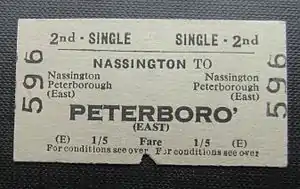 Nassington station closed to passengers on 1 July 1957, (at the same time as Wansford railway station and Castor railway station, the next two stations east towards Peterborough), and to goods on 3 August 1957.[4] The line remained open until the withdrawal of the passenger service from Rugby (Midland) to Peterborough (East) on 6 June 1966. On that date the section from Rugby (Midland) to King's Cliffe was closed completely, but the line east of King's Cliffe station remained open for goods traffic.[5] On 3 June 1968 King's Cliffe station was closed to goods along with the track as far as the junction with a private siding into the ironstone quarries owned by Naylor Benzon 1 kilometre (0.62 mi) west of Nassington station.[6] The last train to the quarry ran on 4 January 1971, and the siding and railway at Nassington finally closed on 26 February 1971.[7]