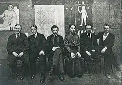 The students rejected from Korovin's classes, and others, soon formed Moscow's first radical independent exhibiting group, the Jack of Diamonds, which was named by Larionov.[6] This is rather a provocative name, as it alludes to both boulevard literature and the prison uniforms.[9]