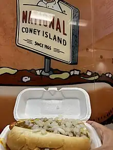 National Coney Island hosts Coney Island hot dogs. Other items on the menu include French fries, loose burgers, and a various list of burgers and sandwiches. Some Greek items on the menu are gyros, rice pudding, and saganaki.[5] The most famous sandwich of National Coney Island is the “Hani”: a chicken-finger pita, which National Coney Island offers in different variants with different kinds of sauces and cheese. A regular hani special contains American and Swiss cheese, while a southwest hani uses pepperjack cheese and chipotle sauce.[5] Another popular item on the National Coney Island menu is the Mr. Pop Burger. This burger is named by the company mascot, Mr. Pop. The burger is made up of sourdough bread, a 1/3 lb. patty, lettuce, tomato, red onion, 1000 island dressing, and pickles on the side. National Coney Island produces its own chili. The chili is available cooked and ready for the customers or frozen and sold separately. The chili is often sold within a Coney Kit as well. This kit contains a brick of chili, two dozen frozen hot dogs, two dozen buns, a bowl of onions, and a bottle of mustard.
