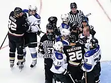 On February 11, 2011, the teams engaged in a vicious brawl. In the game (which the Islanders dominated the Penguins 9–3) the teams combined for 65 penalties, which included 15 fighting majors and 21 game misconducts, resulting in a combined total of 346 penalty minutes. The two teams met in the 2013 Eastern Conference Quarterfinals, with the Penguins coming out on top in six games.[33] Both teams met in the 2019 Eastern Conference first round and the 2021 East Division first round, where the Penguins were favored both times, the former despite being the lower seed, but the Islanders swept the series in 2019 and defeated them in six games in 2021,[34] marking the first time the Islanders clinched a playoff series at Nassau Coliseum since 1993 and the last time the Islanders have won a playoff series in the venue, as they moved to UBS Arena in the 2021–22 season.[35]