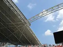 Construction of the stadium began in 2010 due to the delays caused by the 2008 financial crisis and soaring construction costs. By September 2011, the pilling and the foundation of the stadium was completed and construction on the steelworks of the stadium fixed roof started. In July 2013, the installation of the stadium final primary steel 'runway truss' for the roof was completed marking the completion of the steelworks on the National Stadium's fixed roof in preparation for installation of the retractable roof.[6][7] The stadium was set to be completed in April 2014. In February 2014, Sports Hub CEO Philippe Collin Delavaud announced that it would miss the deadline, and not open until June 2014.[8]