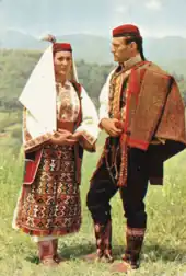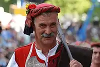 Perhaps the most famous example of Zagora costume comes from the small town of Vrlika, rich in dance and tradition still carried on today. Both men and women's dress wear is characterized by multiple subjects of clothing over another.[5] For men, the costume consists of carefully chosen pieces worn over each other: a red sash is tied around dark pants with a fringe of threads hanging from the belt in red, blue, or green colors. Due to centuries of military mentality, a special leather belt is worn to carry weapons.[5] Over the shirt is a decorated tunic, elaborate in design and custom-made fringe. The vest that is worn is vastly decorated with gold and red embroidery and patterns and designs, with different styles or material and cut depending on the seasonal weather. Much like the men, the women's dress consists of clothing worn over more clothing: a white blouse, skirt or tunic is most common, with a colorful apron consisting of complicated geometric patterns and fringe worn over, as well as a red vest with gold stitching made in a way to make it stand out from the white blouse.[5] Jewellery consists mainly of beads worn around the neck and silver coins adorned around the costume. Both men and women wear red felt pillbox caps (bareta or crvenkapa), with a white habit attached to the women's.